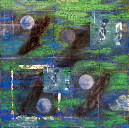 (acrylics, oil, hand prints, metal plate, altered image, paper)