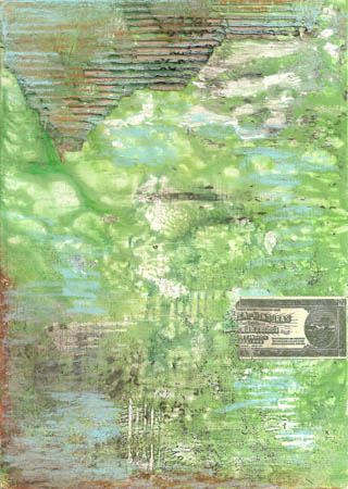 (wood panel, acrylic, corrugated cardboard, paper, glue, printmaking ink, oil pastels)